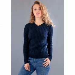 Outlet β Womens 100% Cotton Cable V Neck Talulah Jumper – Navy By Paul James Knitwear π§¨